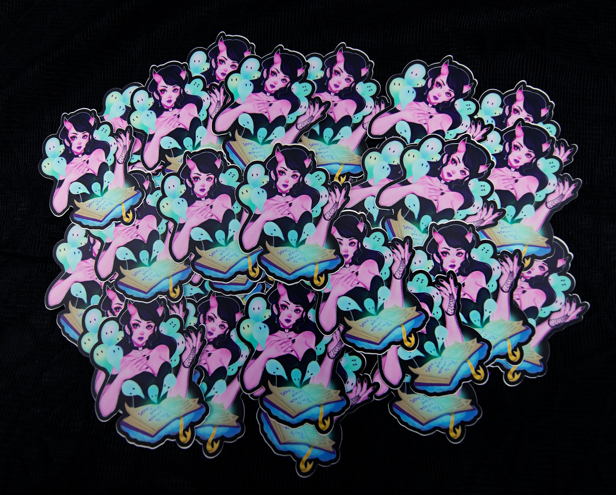 - Sticker pack option includes: 1 glitter coffin sticker, 1 holographic how to summon wicked ghosts sticker, 1 bat logo sticker, and 1 fuck the rest sticker from my old clothing line Ghost Couture (last photo)